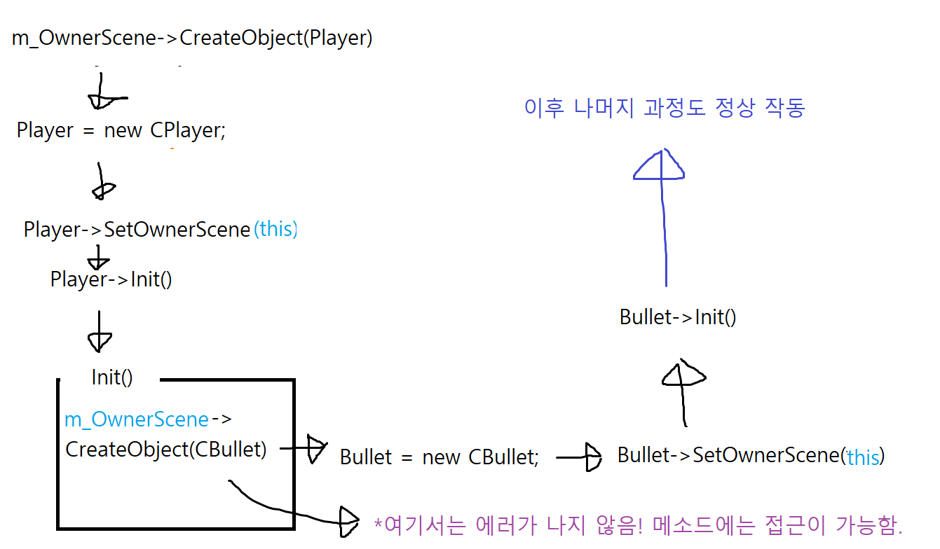- 이전에는 초기화 과정을 먼저 거치고, 자신을 생성한 CScene의 정보를 등록하였음.