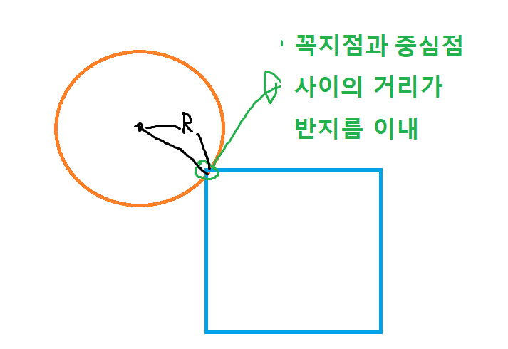 - 사각형의 꼭짓점과 원의 중심점과의 거리를 구해서, 이 거리가 반지름 이내라면 충돌인 것이다.