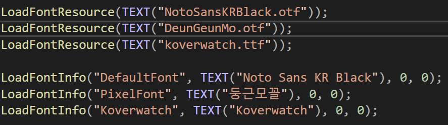 - 또한, 임시로 로드한 이 폰트는 종료할 떄 RemoveFontResource() 함수에서 다시 제거해주어야 한다.