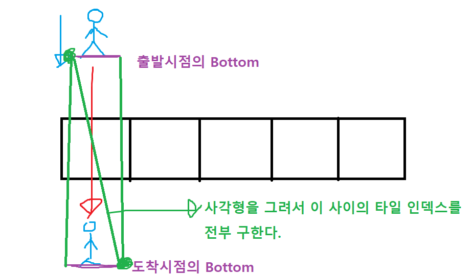 이렇게 구해놓고 중간에 이동 불가 타일이 있을 경우, 도착 시점의 Bottom 값을 충돌 불가 타일의 위로 올려주면 끝이다.
