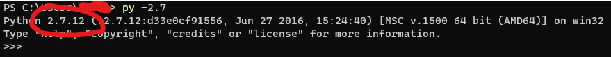 py -2.7을 입력한다. 아래처럼 >>>로 바뀌뀌고 버전이 2.7.12로 나오면 제대로 설치된 것이다.