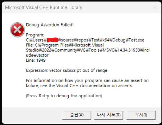 (0번 인덱스의 값을 체크)하는 과정에서는 비어있는 벡터 컨테이너를 강제로 참조하므로 에러가 발생한다.