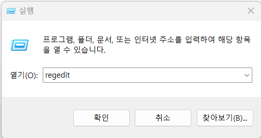 1. Windows+R 키조합에서 regedit 입력 후 확인. 레지스트리 편집기 창이 열린다.
