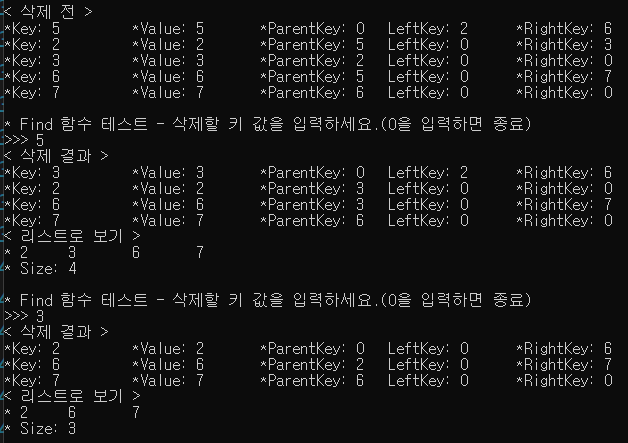 std::cout << "\n* Find 함수 테스트 - 삭제할 키 값을 입력하세요.(0을 입력하면 종료)\n>>> ";
