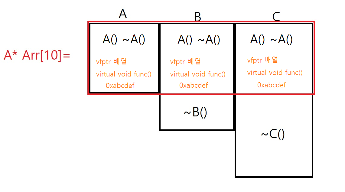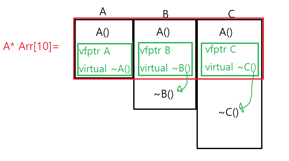 부모 클래스의 소멸자에 virtual을 붙여 주면, 클래스 B와 클래스 C는 알아서 자기 자신의 소멸자를 '오버라이딩'하여 vfptr에 가지고 있게 된다.