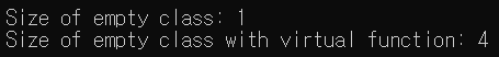 std::cout << "* Size of empty class with virtual function: " << sizeof(SizeTestVirtual) << std::endl;