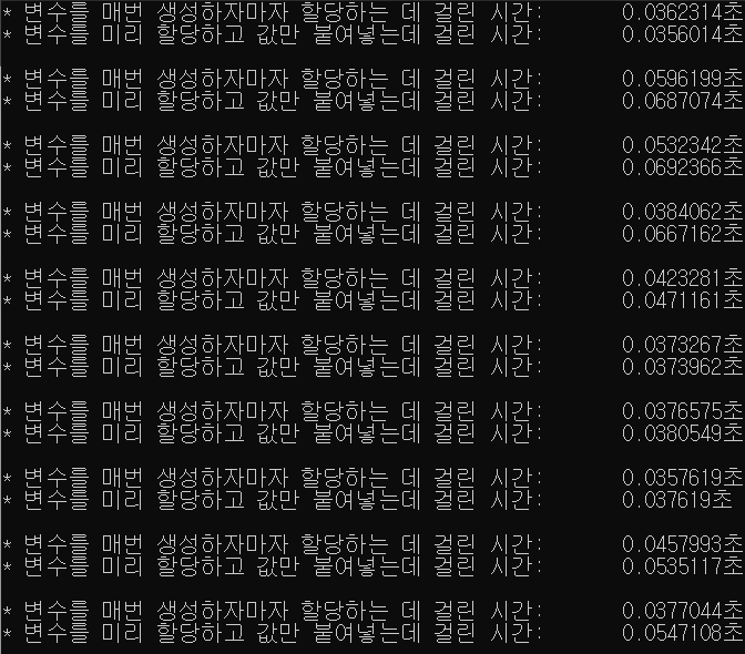std::cout << "* 변수를 매번 생성과 동시에 할당하는 데 걸린 시간:\t" << Elapsed1 << "초" << std::endl;